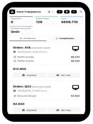 Cuando se realiza el pago, el sistema inmediatamente emite una boleta, luego envia al vendedor un detalle con el pedido, se imprime el pedido en una impresora bluethoot basica y el numero de orden sale en la pantalla para que el cliente pueda ver en que proceso esta su pedido.